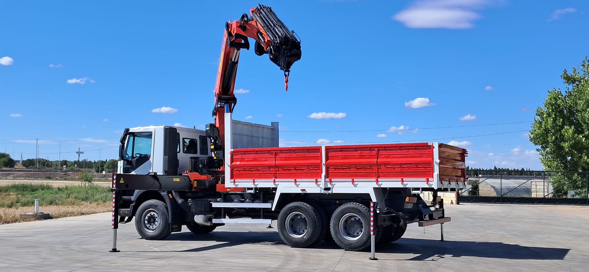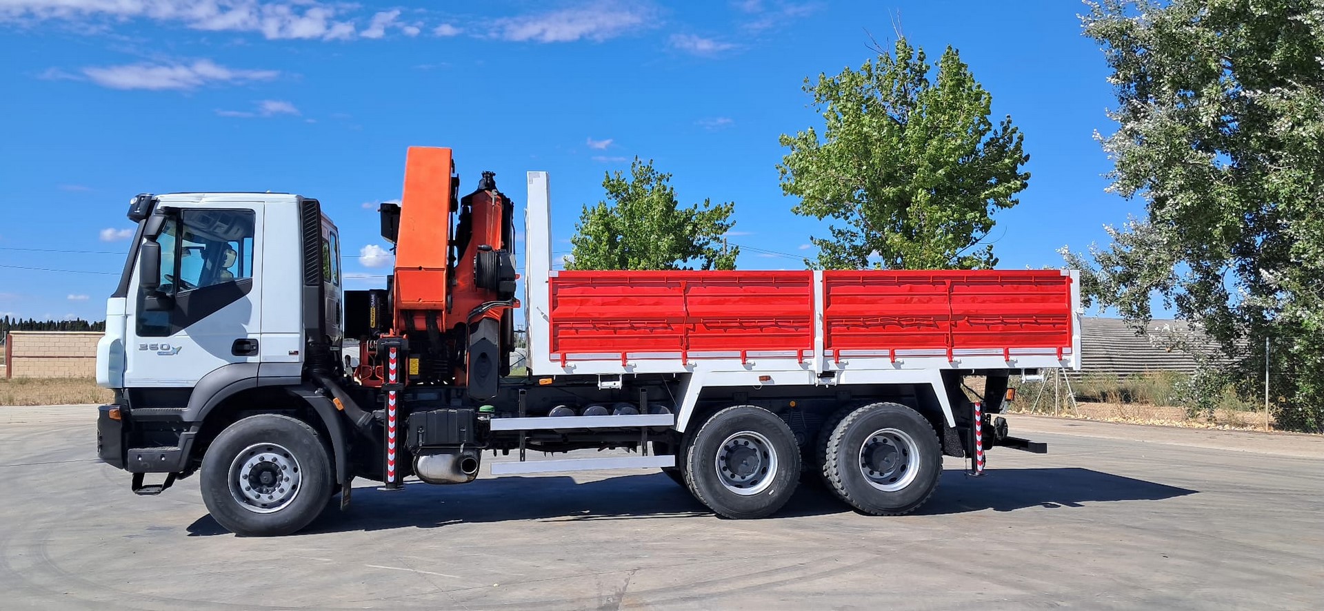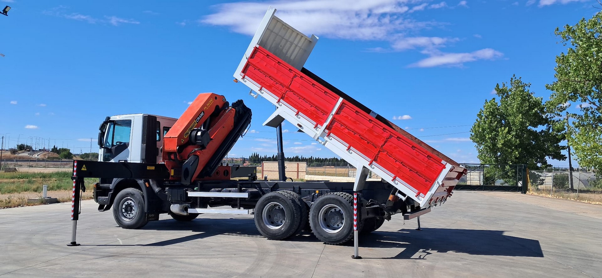 CAMION USADO IVECO 310, Tracción 6x4, Año 2007, Euro 4, Km 230.000, Cambio manual, Aire acondicionado, Elevalunas eléctricos, Caja 5.400 volquete, Palfinger pk 36002, 8 prolongas + 2 manuales, Cabrestante, 4 patas hidráulicas y Mando radio.