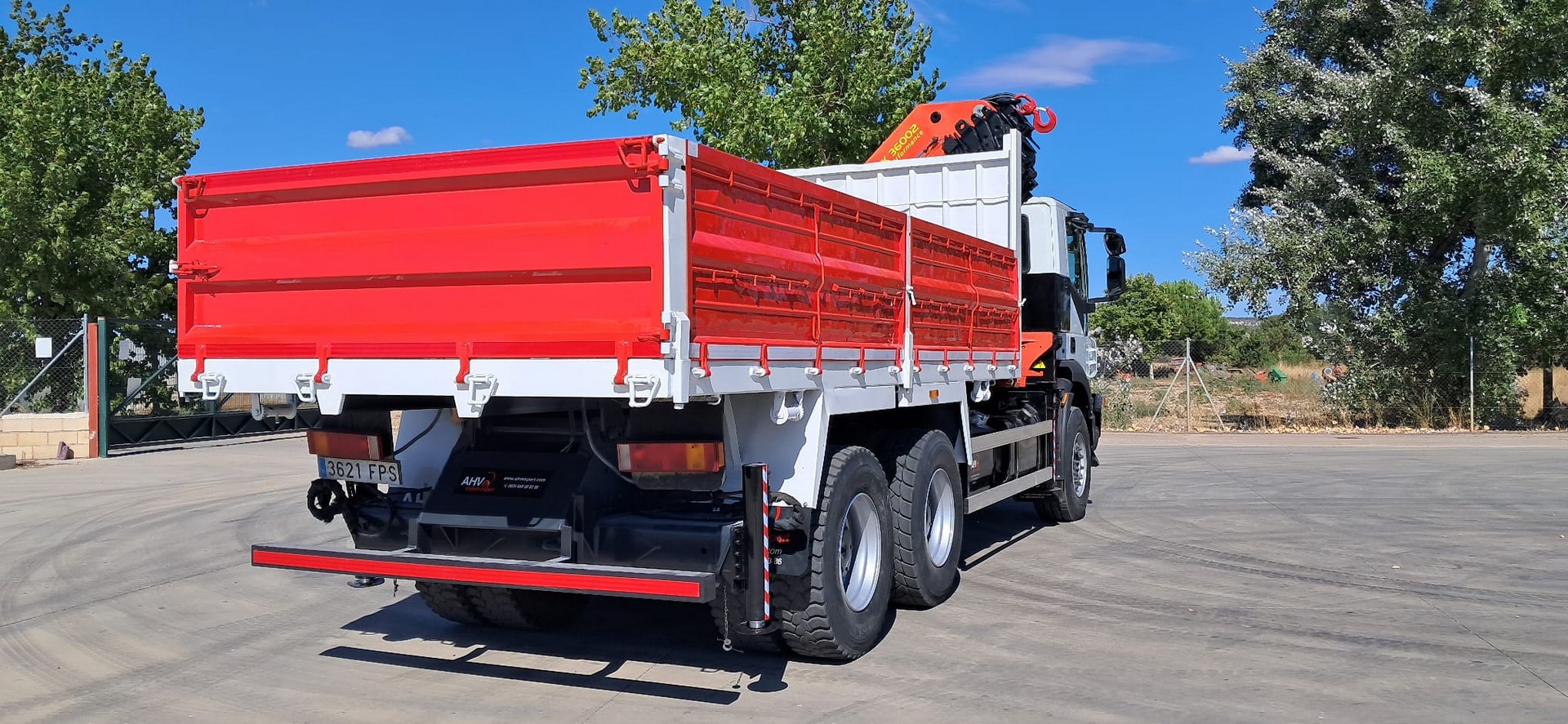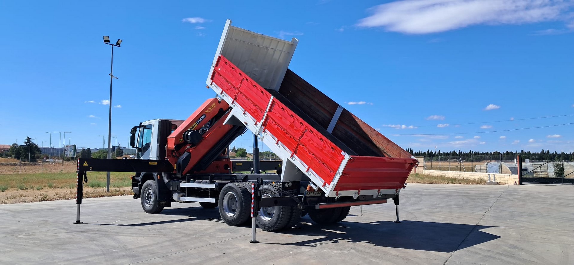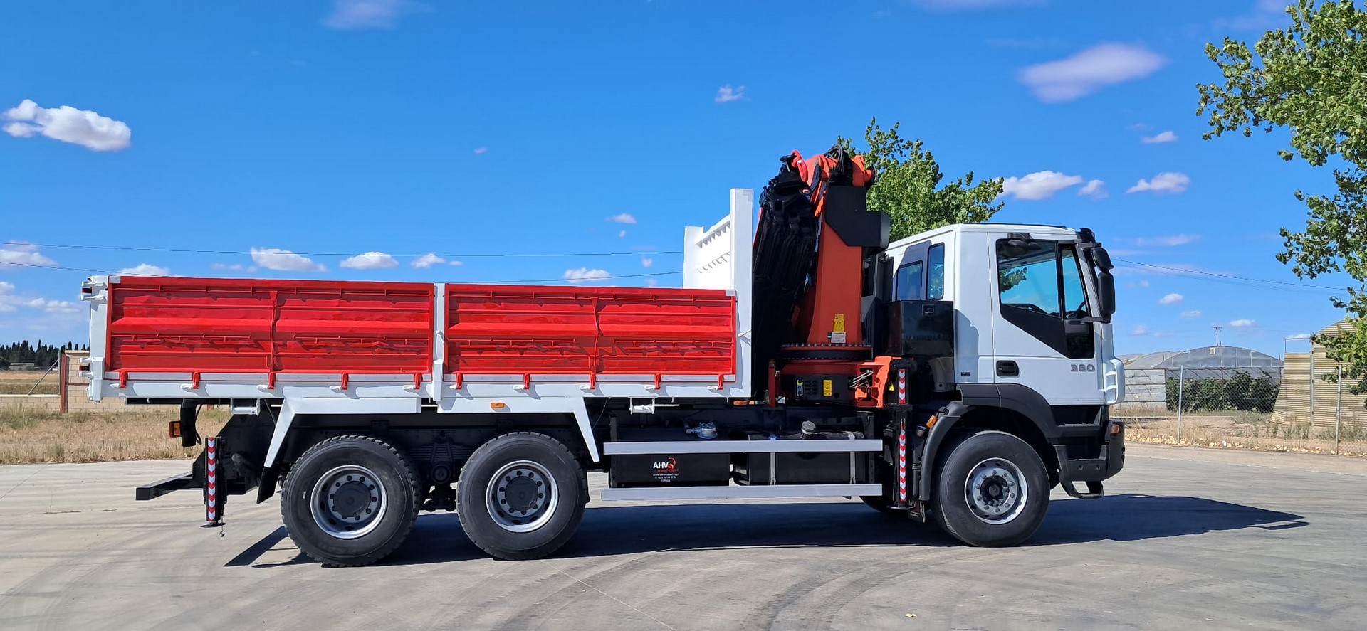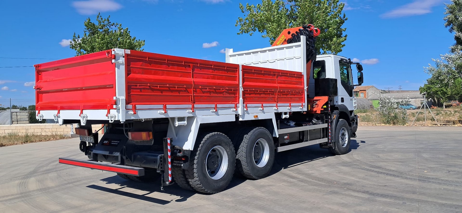 CAMION USADO IVECO 310, Tracción 6x4, Año 2007, Euro 4, Km 230.000, Cambio manual, Aire acondicionado, Elevalunas eléctricos, Caja 5.400 volquete, Palfinger pk 36002, 8 prolongas + 2 manuales, Cabrestante, 4 patas hidráulicas y Mando radio.