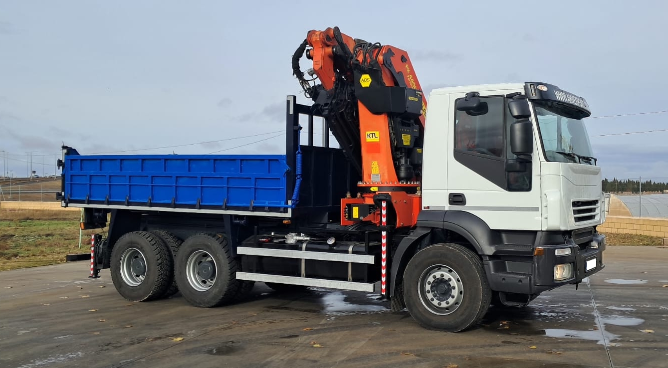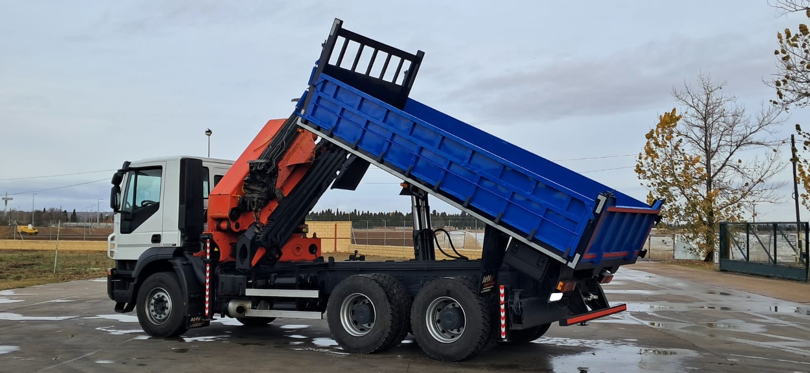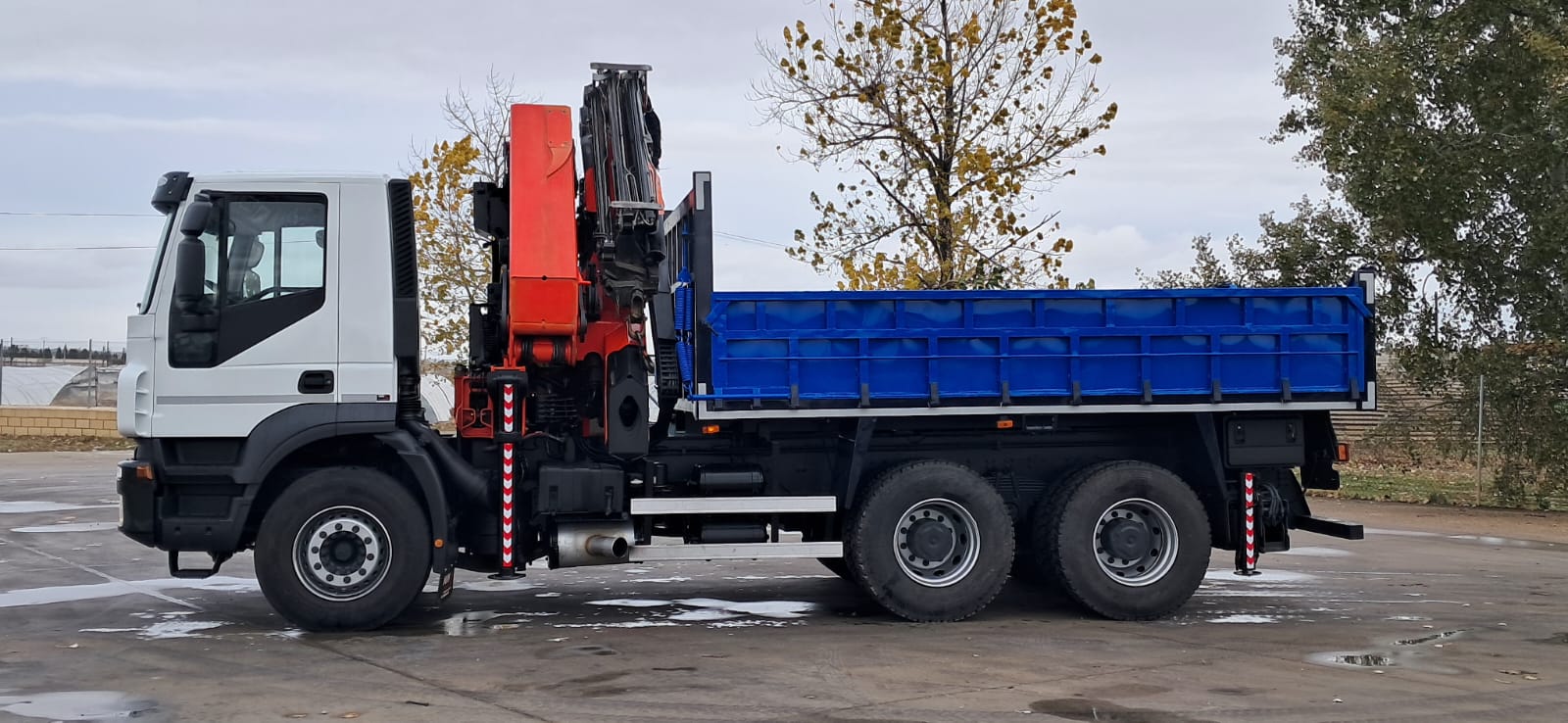 CAMION VOLQUETE + GRUA USADO , Iveco 350 , Tracción 6x4 , Año 2007 , Euro 4, Cambio manual, Chasis corto , distancia entre 1er y 2do eje 3.820mm ,  Caja 4800mm , volquete , Aire acondicionado , Elevalunas eléctricos , Palfinger PK 44002 + JIB , 5 prolongas hidráulicas + 5 JIB , Mando radio , 4 patas hidráulicas , Instalación para cabrestante PERFECTO ESTADO (PALFINGUER PLAFINGER PLAFINGUER PALFINDER PARFINGER PARFINGUER PK44002 PK44.002 PK 44.002 PK42002 PK 42002 PK42.002 PK 42.002 )