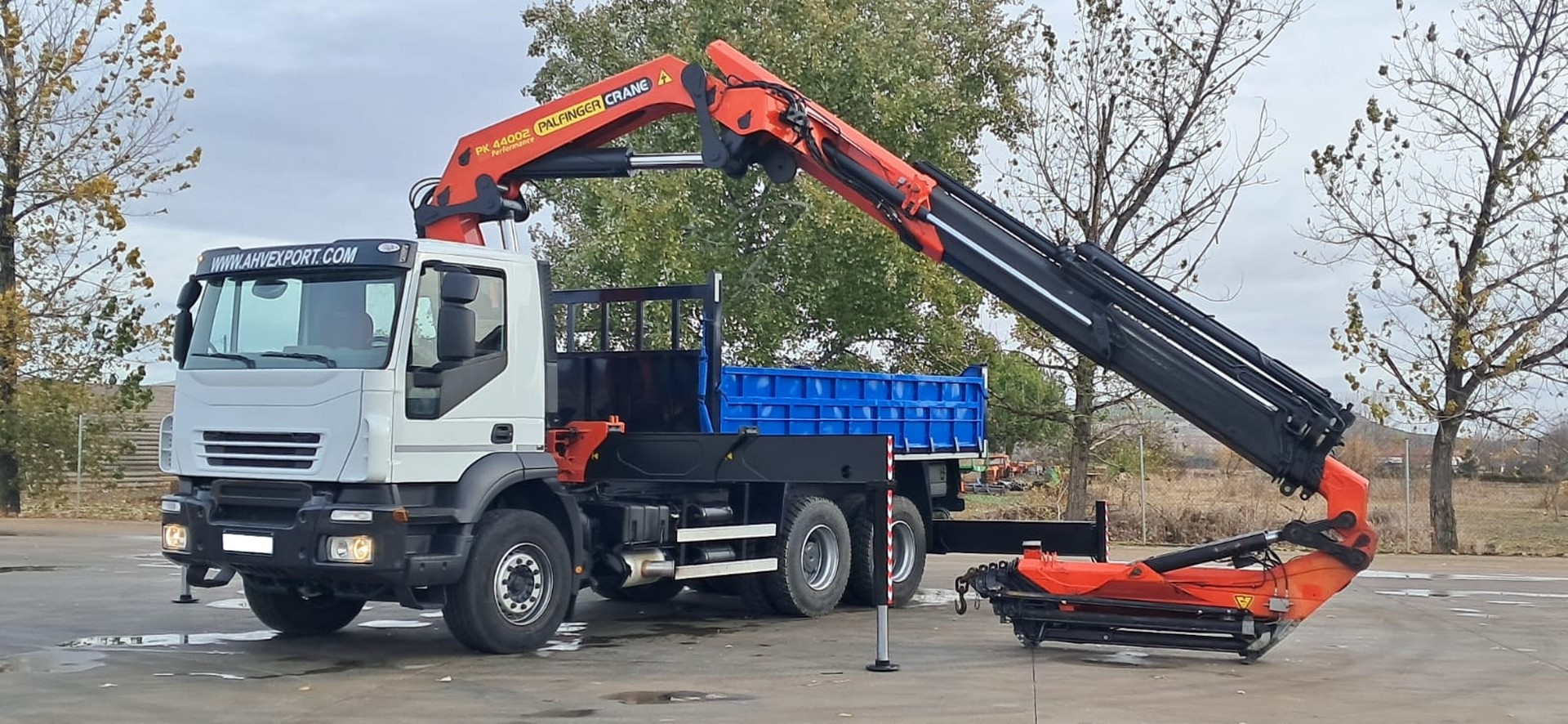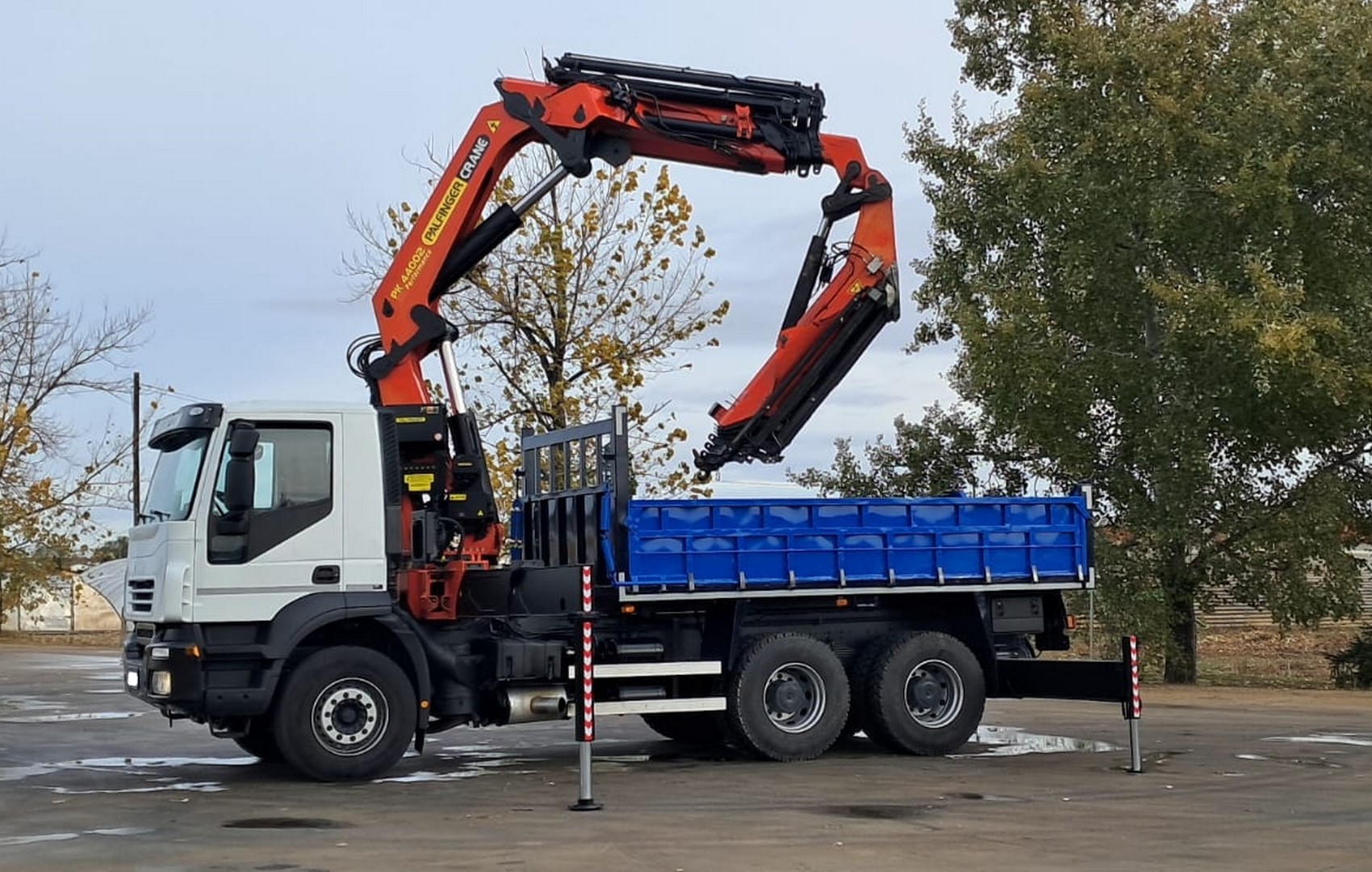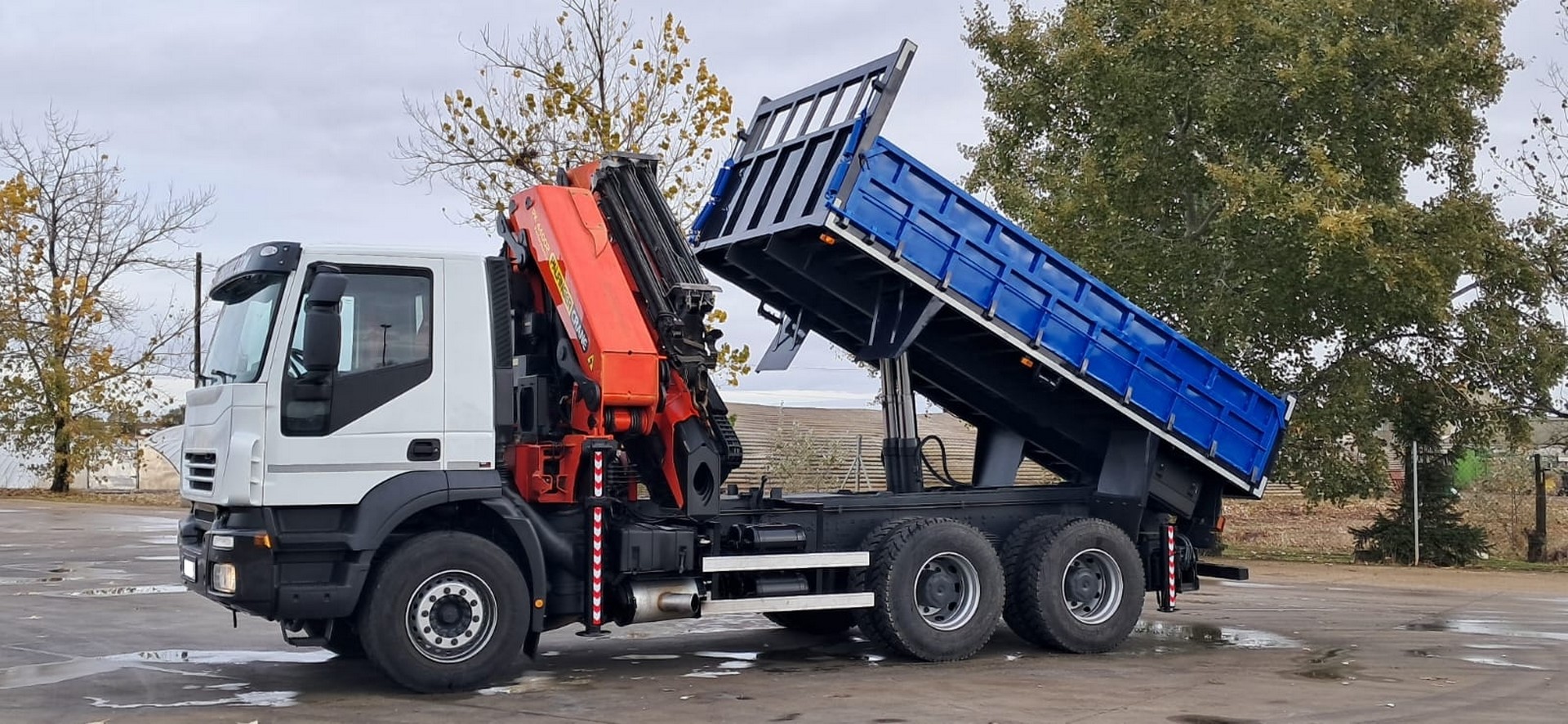 CAMION VOLQUETE + GRUA USADO , Iveco 350 , Tracción 6x4 , Año 2007 , Euro 4, Cambio manual, Chasis corto , distancia entre 1er y 2do eje 3.820mm ,  Caja 4800mm , volquete , Aire acondicionado , Elevalunas eléctricos , Palfinger PK 44002 + JIB , 5 prolongas hidráulicas + 5 JIB , Mando radio , 4 patas hidráulicas , Instalación para cabrestante PERFECTO ESTADO (PALFINGUER PLAFINGER PLAFINGUER PALFINDER PARFINGER PARFINGUER PK44002 PK44.002 PK 44.002 PK42002 PK 42002 PK42.002 PK 42.002 )